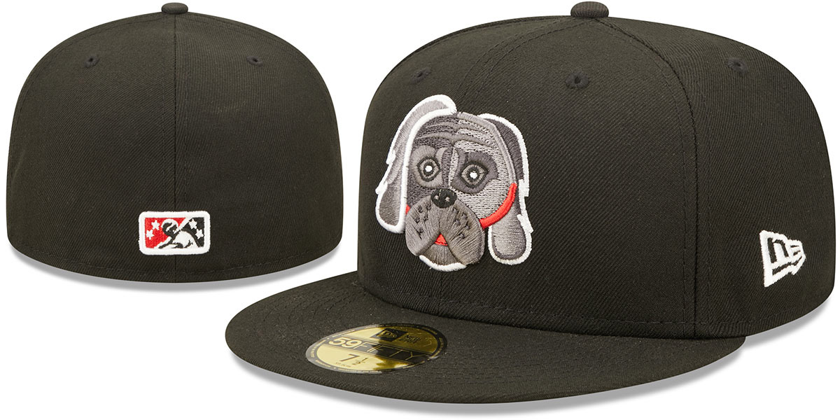 Authentic and ORIGINAL 59FIFTY onfield poly fitted hat by New Era, black crown and visor, black undervisor, embroidered Lehigh Valley IronPigs Minor League New Era EXCLUSIVE THEME NIGHT Dog team logo on front, New Era logo on side, matching raised embroidered MiLB Minor League logo on back, These hats will be worn during select Minor League Theme Night games. This Lehigh Valley IronPigs baseball cap is made by New Era and is licensed by the MiLB - Minor League Baseball.
