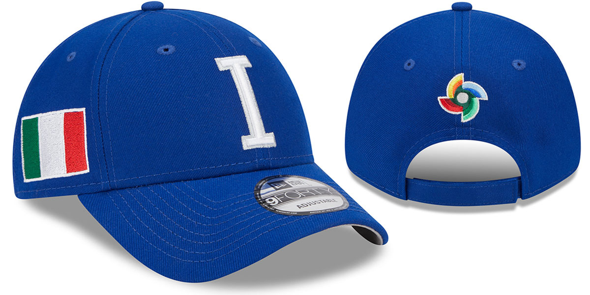 Authentic 9FORTY strapback hat by New Era with a lightly structured rounded crown and curved brim, royal blue authentic poly crown and visor, light grey undervisor, raised embroidered World Baseball Classic team logo on front, embroidered country flag on side, embroidered WBC logo on back above matching Velcro strap closure, This is the curved brim style of On-field hat worn by all teams during the 2023 World Baseball Classic. This hat is made by New Era and is licensed by the WBC World Baseball Classic.