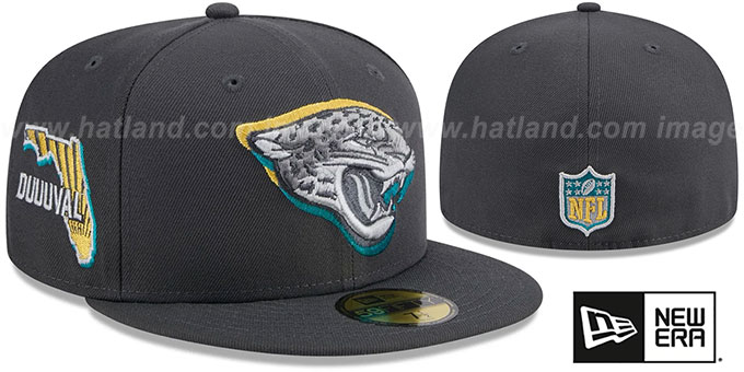 Authentic and original 59FIFTY fitted hat by New Era, featuring a charcoal gray crown and visor made of durable poly fabric. The light gray undervisor complements the raised, gray-tone embroidered team logo on the front, which has a subtle team color shadow effect. The side sports a Florida 'DUUUVAL' patch, while the back showcases an embroidered team color NFL shield logo. Completing the design is the embroidered New Era logo on the opposite side. This 59FIFTY hat was the official headwear worn during the 2024 NFL Draft. This Jacksonville Jaguars baseball cap is made by New Era and is licensed by the NFL National Football League.