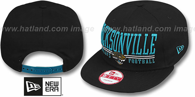 Original 9FIFTY fit adjustable cotton twill hat by New Era that has similar deep crown and flat brim fit as the 59-Fifty, black crown and visor with throwback green undervisor, raised embroidered city name in large block lettering with embroidered team logo and name on front, New Era logo on side, team color plastic adjustable Snapback strap. This Jacksonville Jaguars hat is made by New Era and is licensed by the NFL National Football League.