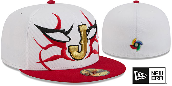 Authentic and ORIGINAL 59FIFTY fitted hat by New Era, white authentic poly crown and red visor, red undervisor, black headband inside cap, metallic gold raised embroidered World Baseball Classic team logo on front with outline and Japanese theme embroidery around logo, matching embroidered New Era logo on side, embroidered WBC logo on back. This Japan baseball cap is made by New Era and is licensed by the WBC - World Baseball Classic.