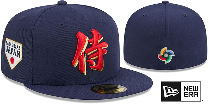 Authentic and ORIGINAL 59FIFTY fitted hat by New Era, navy blue authentic poly crown and navy visor, navy blue undervisor, black headband inside cap, raised embroidered Kanji Samurai team logo on front, embroidered SAMURAI JAPAN home plate on side patch, matching embroidered New Era logo on opposite side, embroidered WBC logo on back. This Japan baseball cap is made by New Era and is licensed by the WBC - World Baseball Classic.