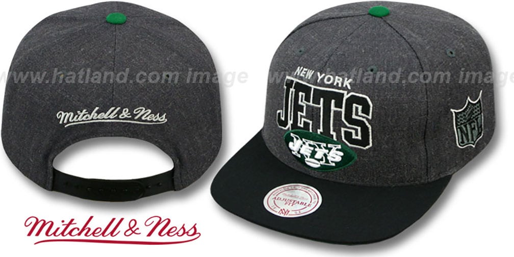 Authentic wool blend adjustable hat by Mitchell & Ness with original cut and flat brim, heather charcoal grey crown with black visor, throwback grey undervisor, team color button, embroidered arched team name in black and white over team color team logo on front, matching NFL logo embroidered on side, matching embroidered Mitchell & Ness logo on back above adjustable plastic Snapback strap. This New York Jets hat is made by Mitchell & Ness and is licensed by the NFL National Football League.