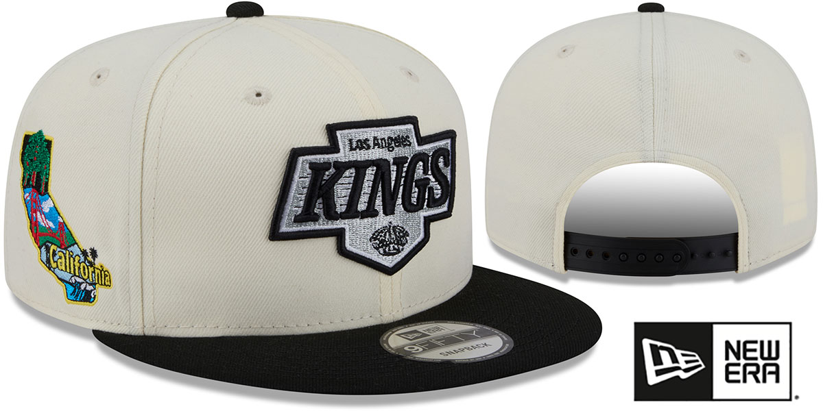 Original 9FIFTY adjustable poly hat by New Era that has similar deep crown and flat brim fit as the 59-Fifty, chrome (cream off white) crown with black visor, kelly green undervisor, raised embroidered team logo on front in team colors, embroidered New Era logo on side, embroidered Localized California state logo on side, team color adjustable Snapback closure. This Los Angeles Kings hat is made by New Era and is licensed by the NHL - National Hockey League.