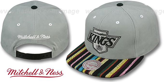 Authentic bruched cotton adjustable hat by Mitchell & Ness with original cut and flat brim, team color light grey crown, multi-colored native aztec striped fabric visor and undervisor (stripes vary and are not perfectly straight), raised embroidered team logo on front, embroidered Mitchell & Ness logo on back above matching adjustable plastic Snapback strap. This Los Angeles Kings hat is made by Mitchell & Ness and is licensed by the NHL - National Hockey League.