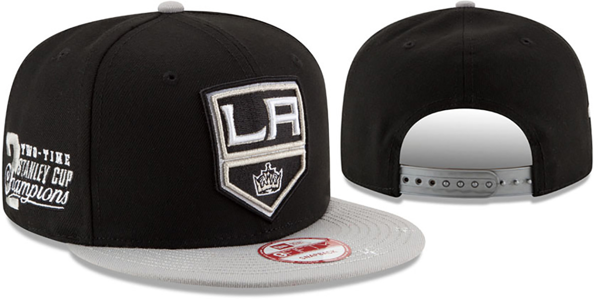 Original 9FIFTY fit adjustable poly hat by New Era that has similar deep crown and flat brim fit as the 59-Fifty, black crown and light grey visor with 2 stars on brim, light grey undervisor, raised embroidered team logo on front, embroidered 2-TIME STANLEY CUP Champions on side, New Era logo on opposite side, grey adjustable Snapback strap. This Los Angeles Kings hat is made by New Era and is licensed by the NHL - National Hockey League.