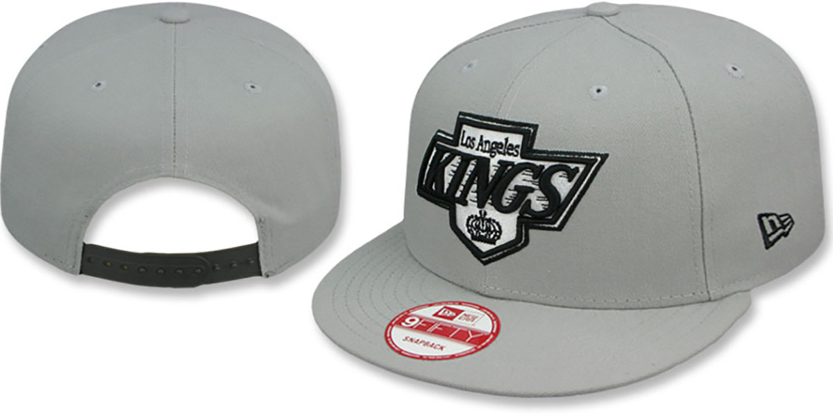Original fit 9FIFTY adjustable authentic poly hat by New Era that has similar deep crown and flat brim fit as the 59-Fifty, light grey crown and visor, light grey undervisor, raised embroidered Vintage, Old School team logo on front in black and white, black plastic adjustable Snapback strap closure. This Los Angeles Kings hat is made by New Era and is licensed by the NHL - National Hockey League.