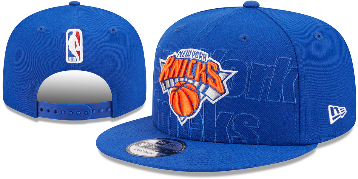 Original fit 9FIFTY adjustable hat by New Era that has similar deep crown and flat brim fit as the 59-Fifty, team color royal blue authentic poly crown and visor, light grey undervisor, tonal embroidered large block team name across front two panels with raised embroidered team logo, embroidered New Era logo on side, raised embroidered NBA logo on back above matching Snapback closure, The 9FIFTY hat worn onstage during the 2023 NBA Draft and will be worn during the 2023-24 season. This New York Knicks hat is made by New Era and is licensed by the NBA - National Basketball Association.