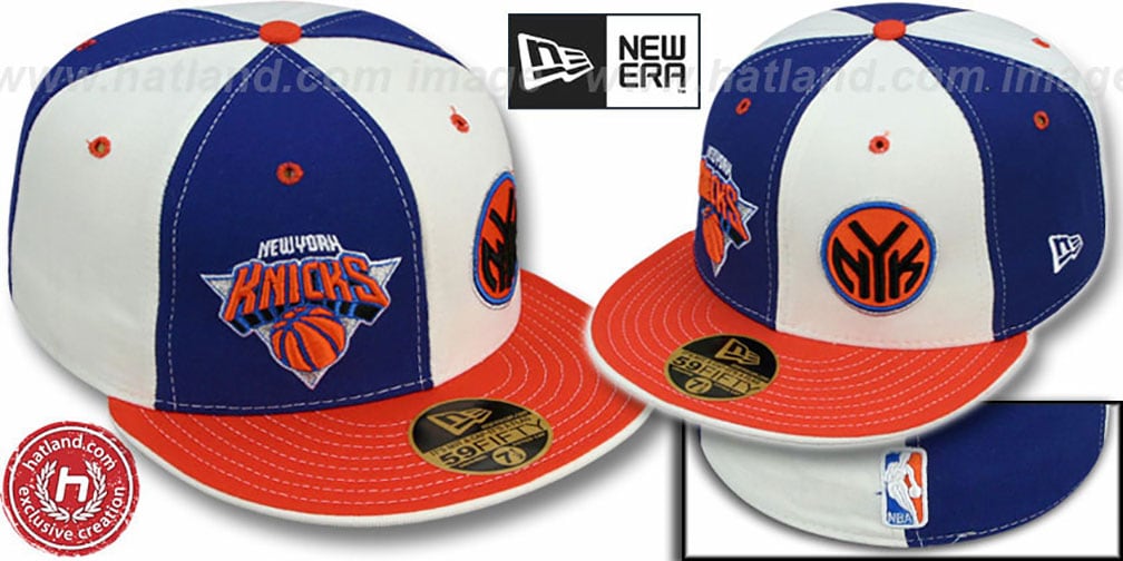 'Authentic' New Era ORIGINAL 59FIFTY fitted hat, 100% wool royal and white alternating pinwheel panels on deep crown, orange visor with white flip undervisor, raised embroidered DOUBLE WHAMMY dual team logos on front and NBA Logoman on back. Small embroidered New Era flag on left side in white. This New York Knicks baseball cap is made by New Era and is licensed by the NBA - National Basketball Association.