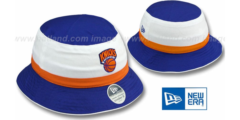 Fitted cotton Bucket hat by New Era, royal blue top-white with orange stripe in center-royal brim with white piping trim, Raised Hardwood Classics team logo embroidery on front and New Era flag logo on side. This New York Knicks hat is made by New Era and is licensed by the NBA - National Basketball Association.
