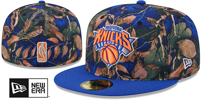 Exciting new 59Fifty fitted hat by New Era! Features a multi colored Leaves printed authentic poly crown and royal blue visor, light grey undervisor, and black sweatband. A matching raised embroidered team logo on the front, with an embroidered New Era logo on the side, and a matching raised embroidered NBA logo on the back.. This New York Knicks hat is made by New Era and is licensed by the NBA - National Basketball Association.