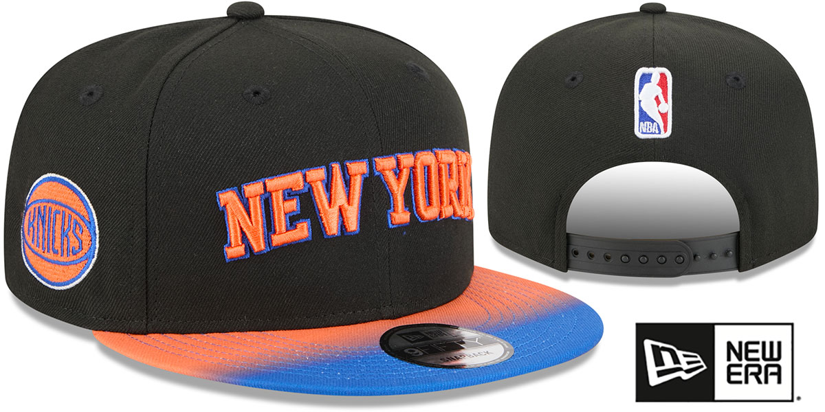 Original fit 9FIFTY adjustable hat by New Era that has similar deep crown and flat brim fit as the 59-Fifty, black authentic poly crown and orange to royal team color fade visor, light grey undervisor, raised embroidered STATEMENT logo on front, embroidered New Era logo on side, matching embroidered STATEMENT design logo on opposite side, raised embroidered NBA logo in white with royal and red fill over team color snapback closure, Produced to match NBA STATEMENT Jerseys worn throughout select 2025-2026 games. This New York Knicks hat is made by New Era and is licensed by the NBA - National Basketball Association.