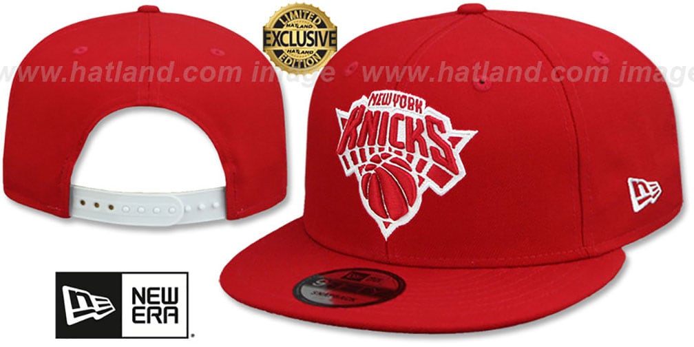 Original fit 9FIFTY adjustable wool hat by New Era that has similar deep crown and flat brim fit as the 59-Fifty, red crown and visor, light grey undervisor, raised embroidered team logo on front in red and white, embroidered New Era flag on side in white, white adjustable Snapback strap closure . This New York Knicks hat is made by New Era and is licensed by the NBA - National Basketball Association.