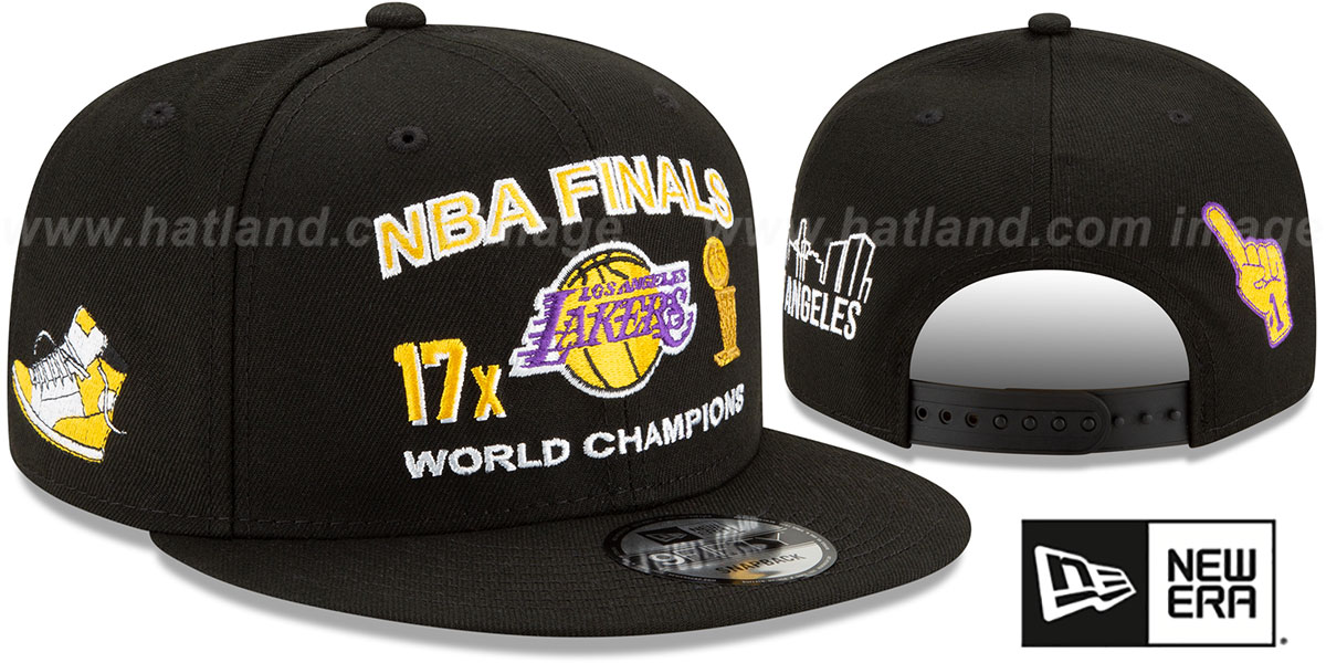 Original fit 9FIFTY adjustable hat by New Era that has similar deep crown and flat brim fit as the 59-Fifty, black authentic poly crown and visor, light grey undervisor, raised embroidered team logo on front with 17X and trophy with NBA FINALS WORLD CHAMPIONS, embroidered New Era logo on side, embroidered sneaker - #1 hand - city name and skyline around crown in matching team colors, matching adjustable snapback closure. This Los Angeles Lakers hat is made by New Era and is licensed by the NBA - National Basketball Association.