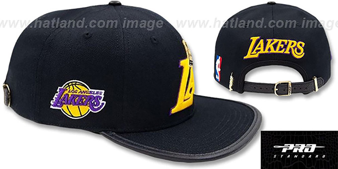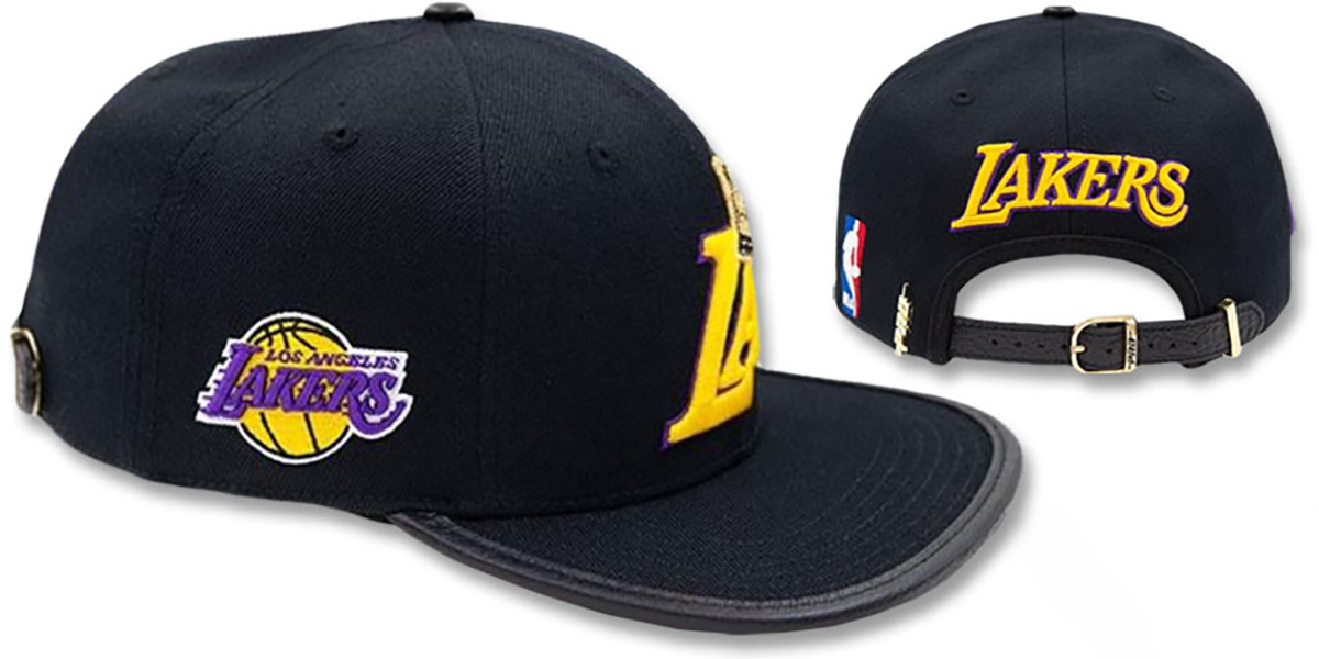 Authentic wool blend adjustable hat by Pro Standard with original cut and flat brim, black crown and visor with 100% premium black leather edging on visor and black undervisor, raised embroidered LA and Crown logo on front, raised embroidered team logo on side, embroidered alternate logo on back with embroidered NBA embroidered logo on side back, matching premium leather strap and metal buckle closure with Pro Standard EXCLUSIVE stretch band attached to leather strap. This Los Angeles Lakers hat is made by Pro Standard and is licensed by the NBA - National Basketball Association.