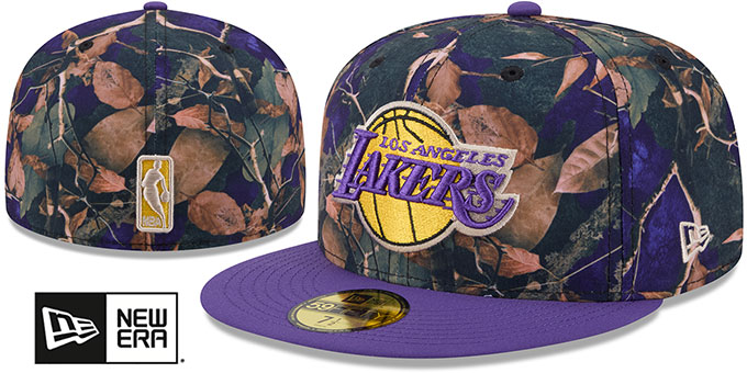 Exciting new 59Fifty fitted hat by New Era! Features a multi colored Leaves printed authentic poly crown and purple visor, light grey undervisor, and black sweatband. A matching raised embroidered team logo on the front, with an embroidered New Era logo on the side, and a matching raised embroidered NBA logo on the back.. This Los Angeles Lakers hat is made by New Era and is licensed by the NBA - National Basketball Association.