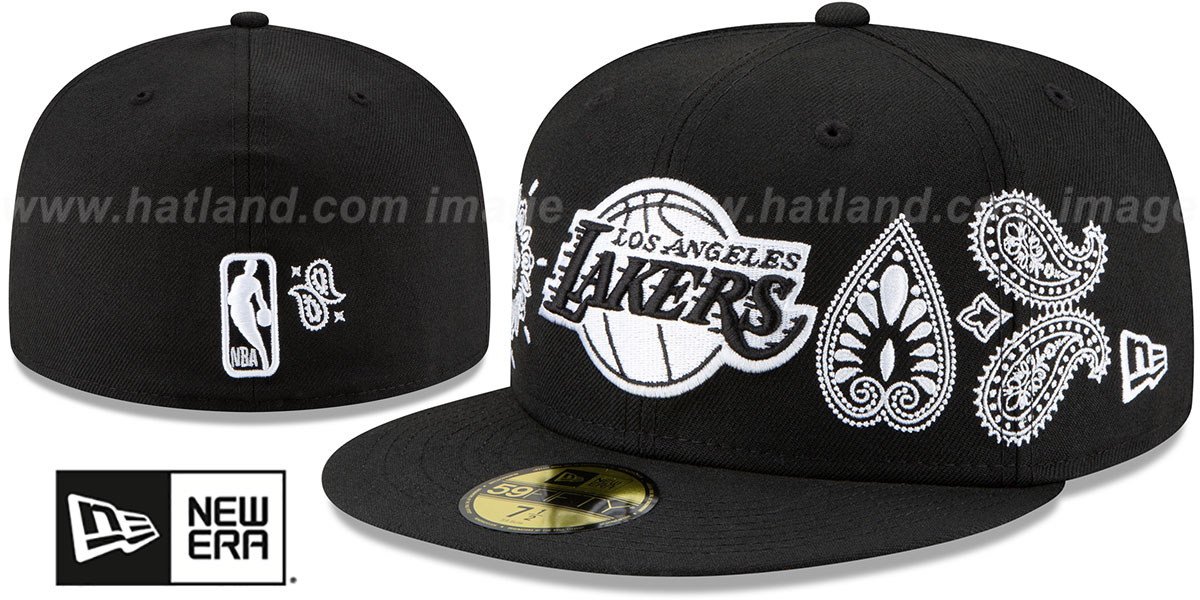 Authentic and Original 59FIFTY fitted hat by New Era, black wool crown and visor, light grey undervisor, raised embroidered team logo on front with embroidered black and white Paisley Elements pattern across front two panels and two side panels, New Era embroidered logo on side, matching team color raised embroidered NBA logo on back with embroidered paisley to the side. This Los Angeles Lakers baseball cap is made by New Era and is licensed by the NBA - National Basketball Association.