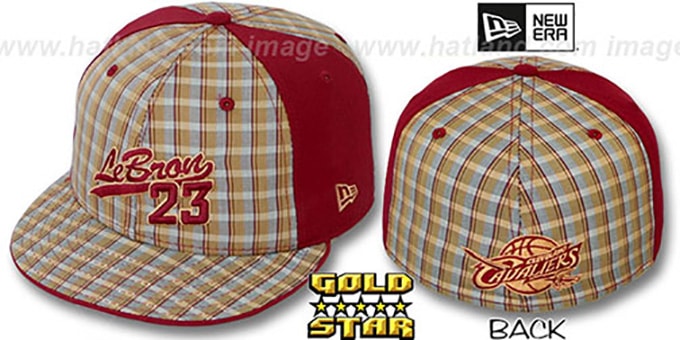 'AUTHENTIC' and 'ORIGINAL' 59FIFTY fitted hat by New Era, grey-burgundy-old gold plaid front and back panels and visor, burgundy wool mid panels and undervisor, raised embroidered Lebron Script logo and number on front in burgundy with old gold outline, matching team logo on back. This Cleveland Cavaliers baseball cap is made by New Era and is licensed by the NBA - National Basketball Association.
