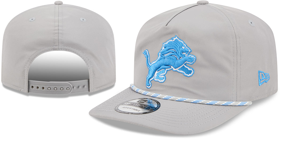 This 19TWENTY adjustable hat by New Era has a relaxed fit crown with pinched front panel construction and a mesh tray insert for light support. It has a poly nylon light grey crown and squared edge pre-curved visor with a team color rope along brim. The undervisor is light grey, and the front sports a raised embroidered team logo in team colors. The side displays a matching embroidered New Era flag, and the back has an adjustable light grey rubber Snapback closure.. This Detroit Lions hat is made by New Era and is licensed by the NFL - National Football League.