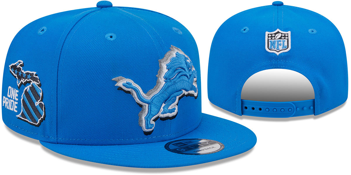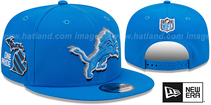 Original fit 9FIFTY adjustable authentic hat by New Era that has similar deep crown and flat brim fit as the 59-Fifty, carolina blue authentic poly deep crown and visor, light grey undervisor, raised embroidered team logo with silver shadow effect, embroidered Michigan 'ONE PRIDE' side patch, embroidered New Era logo on opposite side, embroidered NFL Shield logo in team colors above matching adjustable snapback closure, The 9FIFTY SNAPBACK hat worn during the 2024 NFL Draft. This Detroit Michigan hat is made by New Era and is licensed by the NFL - National Football League.