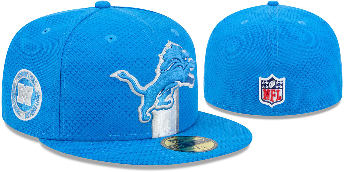 This authentic 59FIFTY fitted cap by New Era features a blue poly crown and visor with a camouflage print. The undervisor is blue, with a black headband. The front displays the team's raised, embroidered logo along with an embroidered vertical stripe in team colors below. The side bears the team name and NFC logo, also embroidered in team colors, while the opposite side has the New Era logo. An embroidered NFL shield logo appears on the back. This style of cap was worn by all NFL teams on the sidelines at the start of the 2024 season. This Detroit Lions baseball cap is made by New Era and is licensed by the NFL- National Football League.