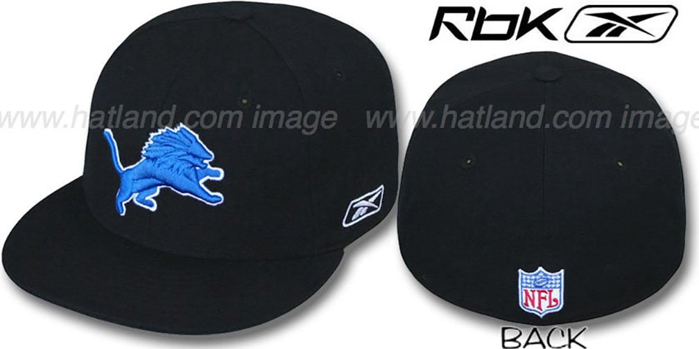 NFL coaches sideline hat, Authentic structured Reebok fitted hat, black wool crown and visor, embroidered team logo on front, Reebok logo on side, NFL shield logo on back. This Detroit Lions hat is made by Reebok and is licensed by the NFL National Football League.