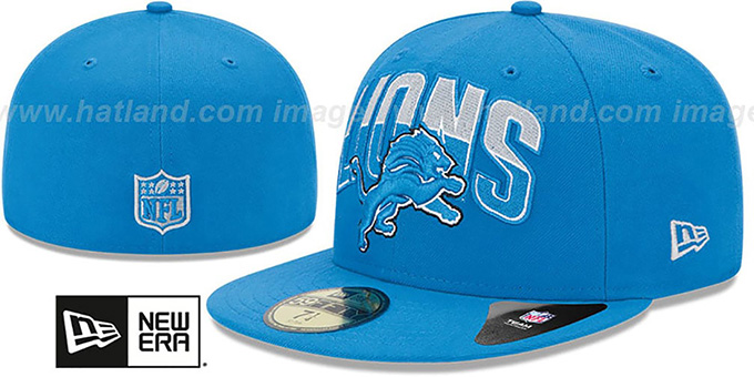 Authentic and ORIGINAL 59FIFTY fitted 100% performance polyester hat by New Era, team color blue deep crown and visor with the high tech fabric that has revolutionary wicking ability, superior drying, and is shrink resistant, team color undervisor with city name. Embroidered conference logo on right side, raised embroidered arched team name over team logo on front, Small New era flag on left side, matching embroidered NFL shield logo on rear of hat. This Detroit Lions baseball cap is made by New Era and is licensed by the NFL National Football League.