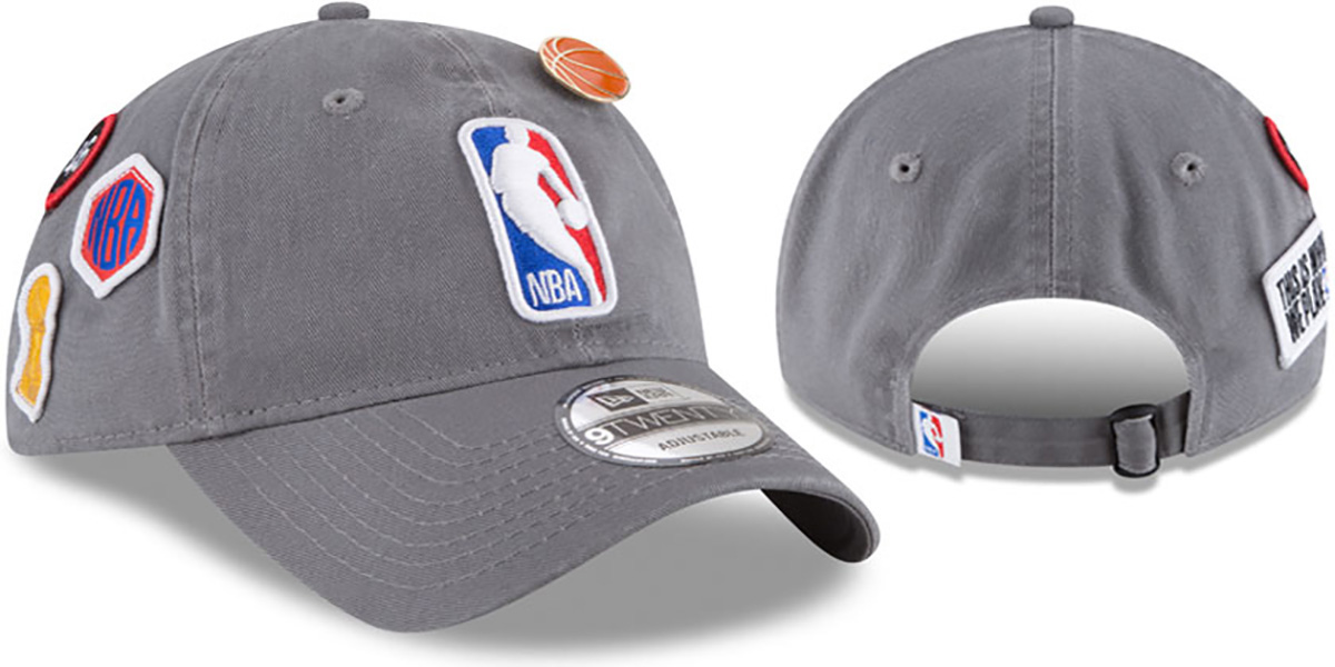 9TWENTY adjustable cotton hat by New Era that is Low-Profile with a rounded lightly structured crown and curved brim, light grey crown and visor and undervisor, raised embroidered team logo on front, basketball pin on top side front, multiple embroidered NBA patches on side, embroidered New Era logo on opposite side, light grey strapback closure with NBA hangtag, The 9TWENTY Strapback hat worn onstage during the 2018 NBA Draft and will be worn during the 2018-19 season. This hat is made by New Era and is licensed by the NBA - National Basketball Association.