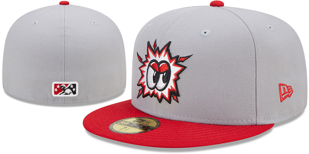Authentic and ORIGINAL 59FIFTY onfield poly fitted hat by New Era, grey deep crown and red visor, black undervisor, embroidered Chattanooga Lookouts Minor League Marvel DEFENDERS OF THE DIAMOND team logo on front, New Era logo on side, matching raised embroidered MiLB Minor League logo on back. This Chattanooga Lookouts baseball cap is made by New Era and is licensed by the MiLB - Minor League Baseball.
