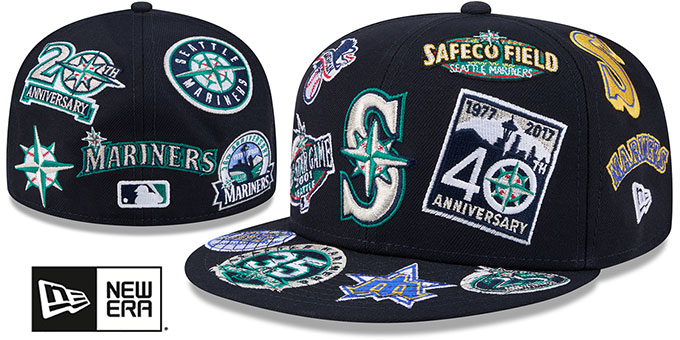 Authentic and ORIGINAL 59Fifty fitted hat by New Era, navy blue authentic poly deep crown and visor with a light grey undervisor, raised embroidered team logo on front, embroidered Cooperstown and associated team logos embroidered ALL-OVER crown and visor, embroidered MLB Batterman logo on back. This Seattle Mariners hat is made by New Era and is licensed by the MLB - Major League Baseball.