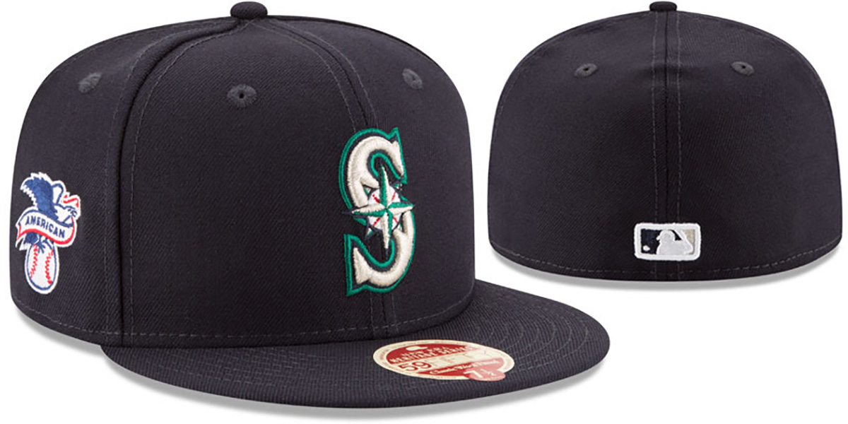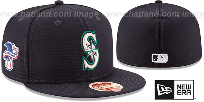 Authentic and ORIGINAL 59Fifty wool fitted hat by New Era from the HERITAGE SERIES, navy blue deep crown and visor, grey undervisor, raised embroidered team logo on front, embroidered American League logo on side, New Era logo on opposite side, matching embroidered MLB logo on back. This Seattle Mariners hat is made by New Era and is licensed by the MLB - Major League Baseball.
