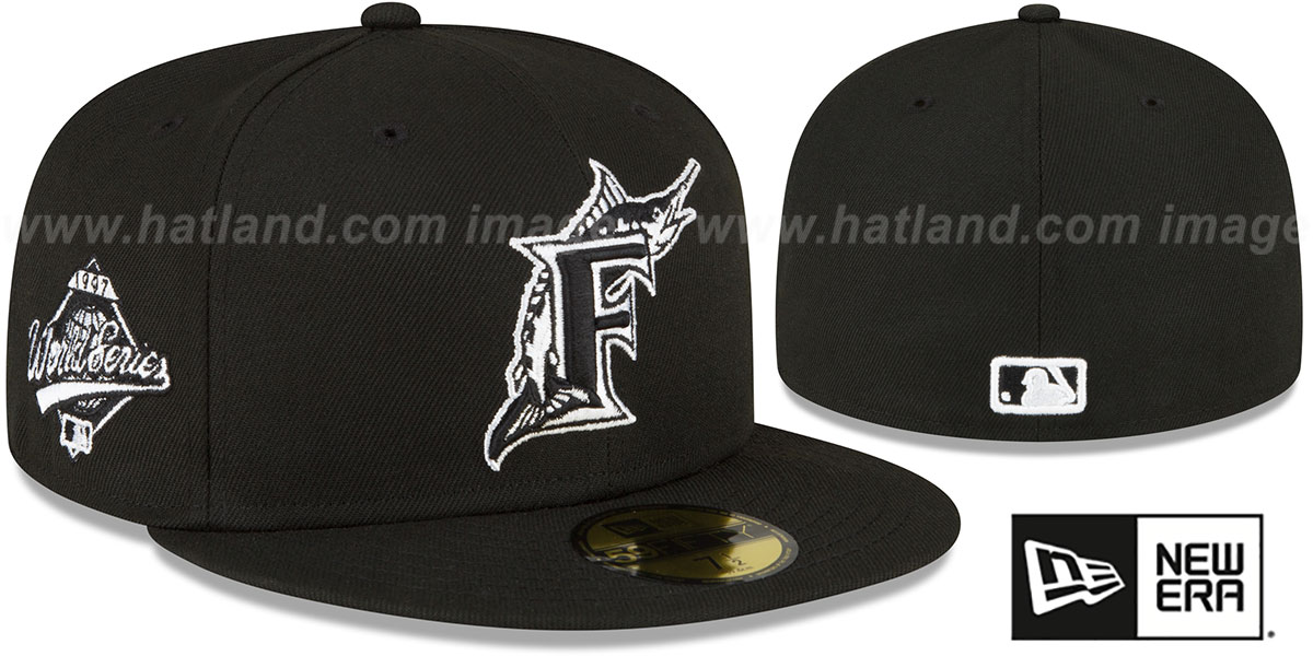 Authentic and Original 59Fifty fitted hat by New Era, black authentic poly crown and visor, light grey undervisor, black sweatband, raised embroidered team logo on front, embroidered 1997 World Series logo side-patch on side in black and white, embroidered New Era logo on opposite side, matching raised embroidered MLB logo on back. This Florida Marlins hat is made by New Era and is licensed by the MLB - Major League Baseball.