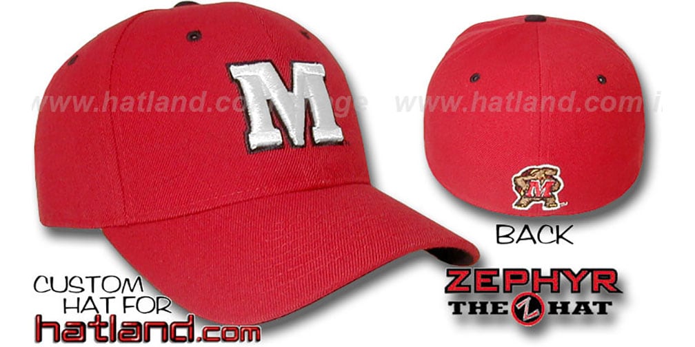 low profile structured 6 panel hat, red wool blend crown and visor, raised embroidered 'M' on front in team colors with outline, embroidered Terps logo on back . This Maryland Terrapins hat is made by Zephyr and is licensed by the NCAA College.