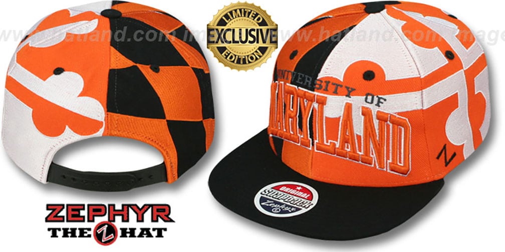 Zephyr's exclusive wool-blend hat for hatland.com boasts a striking Orioles-inspired design. The adjustable black cap features bold orange and white embroidery, including a large 'MARYLAND' graphic on the front. Accented with a light grey undervisor, the snapback-style strap provides a customizable fit. This Maryland Terrapins hat is made by Zephyr and is licensed by the NCAA - College.