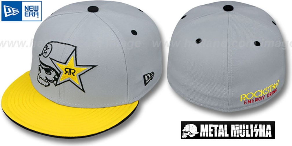 Authentic and Original 5950 fitted hat made by New Era for Metal Mulisha, grey acrylic/wool crown, yellow visor and black flip undervisor. Embroidered Metal Mulisha/Rockstar team logo on front. embroidered Small white and black New Era logo on side. Black eyelets and top button. Rockstar Energy Drink embroidered on back right.. This hat is made by Metal Mulisha.