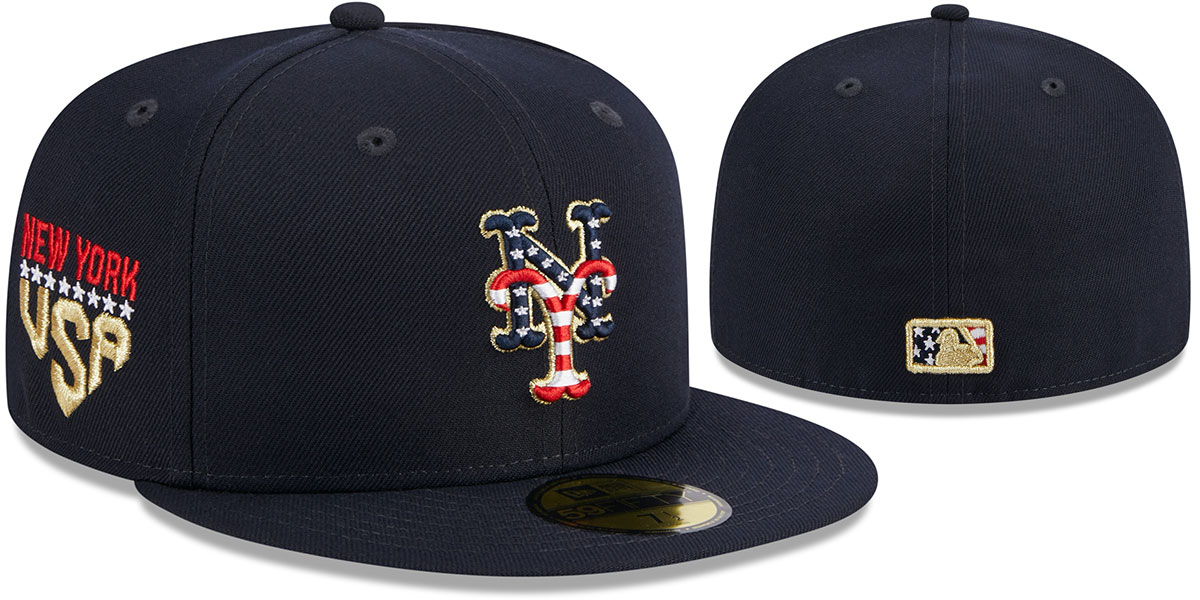 Authentic and Original 59FIFTY fitted hat by New Era, navy blue poly deep crown and navy visor, light grey undervisor, raised embroidered Stars and Stripes team logo on front, embroidered city above stars and USA on side, New Era Flag on opposite side, matching raised embroidered Stars and Stripes MLB logo on back , Official MLB fitted hat worn during the 2023 July 4th games. This New York Mets baseball cap is made by New Era and is licensed by the MLB - Major League Baseball.