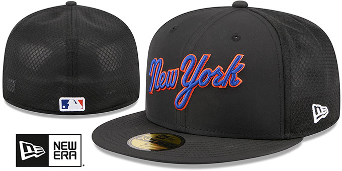 MLB Authentic Collection and ORIGINAL 59FIFTY fitted nylon poly hat by New Era, black nylon crown and visor with black batting practice lightweight performance mesh middle and back panels, black undervisor, raised embroidered team logo on front, embroidered New Era logo on side, raised embroidered MLB logo on back in team colors, This is the style of Onfield Batting Practice hat worn by MLB teams during the 2026 MLB season. This New York Mets baseball cap is made by New Era and is licensed by the MLB - Major League Baseball.