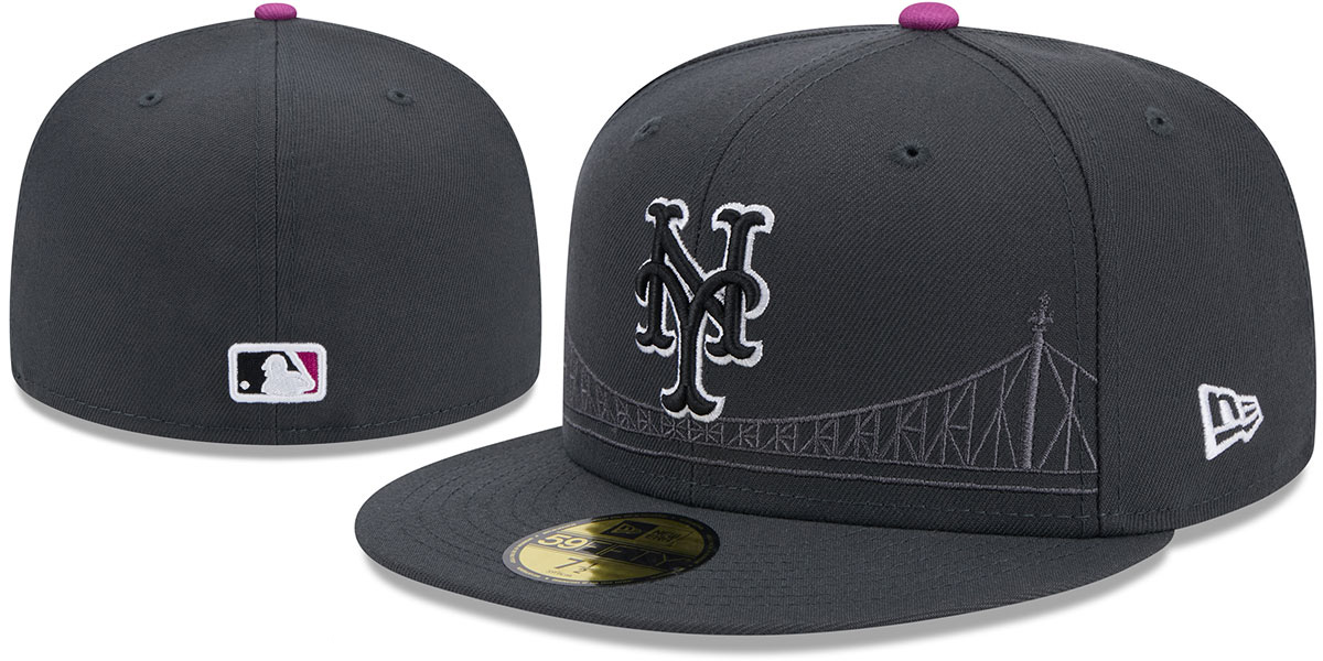 MLB Authentic Collection and ORIGINAL 59FIFTY fitted performance poly hat by New Era, charcoal grey crown and visor, grey and black speckled print undervisor, black headband with multi color print, matching raised embroidered City Connect team logo on front with tonal embroidered bridge, embroidered New Era logo on side, matching raised embroidered MLB logo on back, This is the style of Onfield hat worn by MLB teams during the City Connect games. This New York Mets baseball cap is made by New Era and is licensed by the MLB - Major League Baseball.