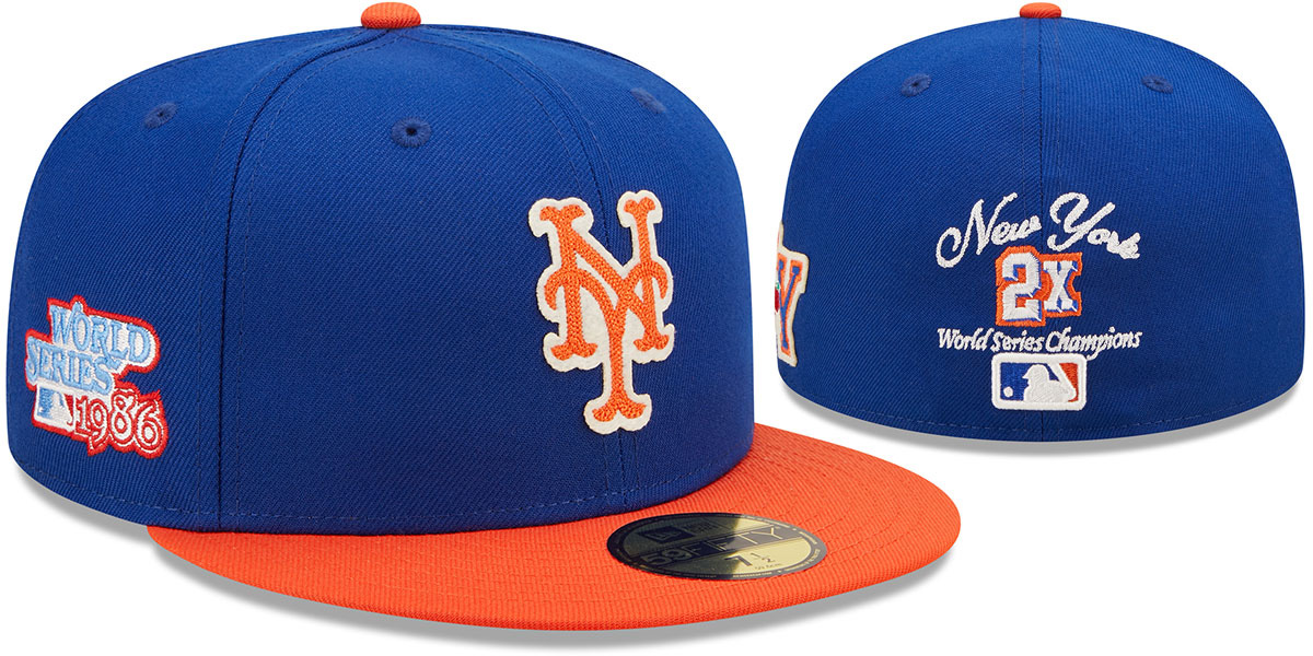 Authentic and Original 59Fifty fitted hat by New Era, team color royal authentic poly crown and orange visor, light grey undervisor, stitched and embroidered Letterman team logo on front, 1986 WORLD SERIES embroidered side-patch, matching stitched and embroidered Letterman NY on side, 2X World Series Champions above raised embroidered MLB logo on back . This New York Mets hat is made by New Era and is licensed by the MLB - Major League Baseball.