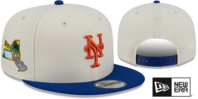 Original 9FIFTY adjustable poly hat by New Era that has similar deep crown and flat brim fit as the 59-Fifty, chrome (cream off white) crown with royal blue visor, kelly green undervisor, raised embroidered team logo on front in team color, embroidered New Era logo on side, embroidered Localized New York state logo on side, team color adjustable Snapback closure. This New York Mets hat is made by New Era and is licensed by the MLB - Major League Baseball.