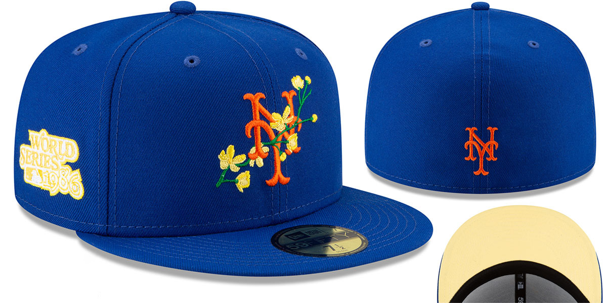 Authentic and Original 59Fifty fitted hat by New Era, royal blue authentic poly crown and visor, light yellow undervisor, black sweatband, embroidered team logo on front with green stalk and yellow flowers, 1986 WORLD SERIES embroidered side-patch in yellow and white, embroidered New Era logo on opposite side, matching embroidered team logo over raised embroidered MLB logo on back . This New York Mets hat is made by New Era and is licensed by the MLB - Major League Baseball.