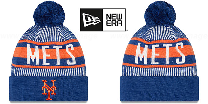 Royal blue, orange, and white acrylic ribbed knit crown with team nickname in white on front and back of crown, embroidered team logo on front of cuff, matching team color pom-pom on top, embroidered New Era Flag on side. This New York Mets hat is made by New Era and is licensed by the MLB - Major League Baseball.