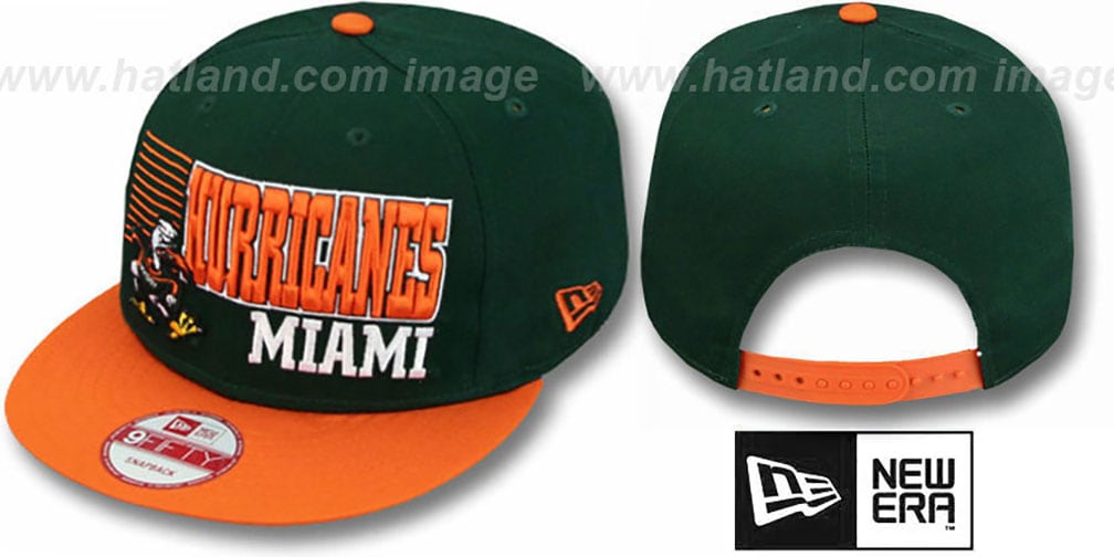 Authentic cotton twill 9FIFTY adjustable hat by New Era with original cut and flat brim, dark green crown and orange visor, throwback green undervisor, embroidered lines and raised embroidered team name and team logo on front, embroidered New Era logo on side, secondary color adjustable plastic Snapback strap. This item is on SALE!. This Miami Hurricanes hat is made by New Era and is licensed by the NCAA - College.