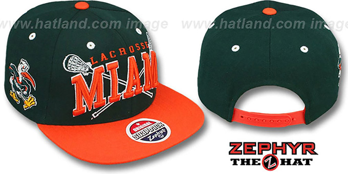 CUSTOM DESIGNED hat by hatland.com Authentic wool blend adjustable hat by Zephyr with original cut and flat brim, team color dark green crown and orange visor, light grey undervisor, large raised embroidered arched team name on front with embroidered LACROSSE and Sticks, team logo embroidered on side, adjustable plastic Snapback strap on back in secondary team color. This item is on SALE!. This Miami Hurricanes hat is made by Zephyr and is licensed by the NCAA College.