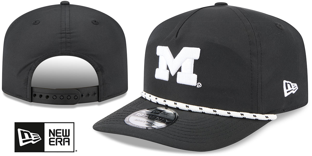 This 19TWENTY adjustable hat by New Era has a relaxed fit crown with pinched front panel construction and a mesh tray insert for light support. It has a poly nylon black crown and squared edge pre-curved visor with a black and white rope along brim. The undervisor is light grey, and the front sports a raised embroidered team logo in black and white with a red eye. The side displays a matching embroidered New Era flag, and the back has an adjustable black rubber Snapback closure.. This Michigan Wolverines hat is made by New Era and is licensed by the NCAA - National Collegiate Athletics Association.