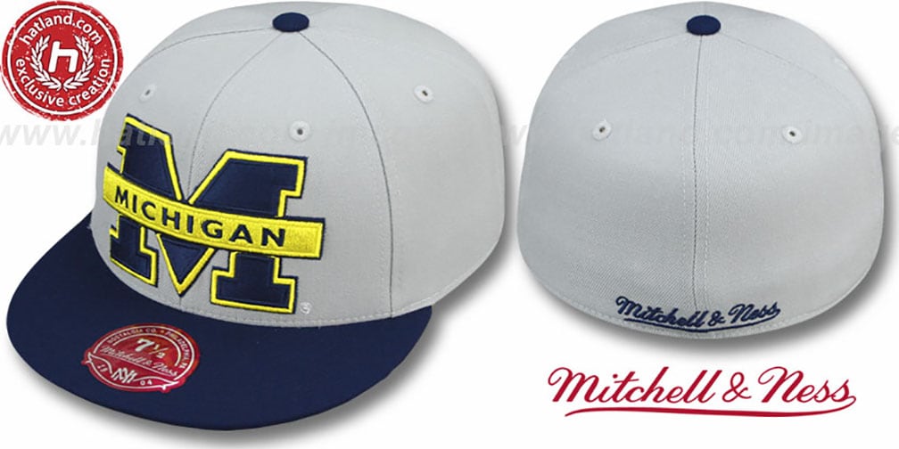 Authentic wool fitted hat by Mitchell & Ness with original cut and flat brim, grey crown and navy blue visor and undervisor, raised embroidered Extra Large team logo on front, matching Mitchell & Ness script embroidery on back. This Michigan Wolverines hat is made by Mitchell & Ness and is licensed by the NCAA College.