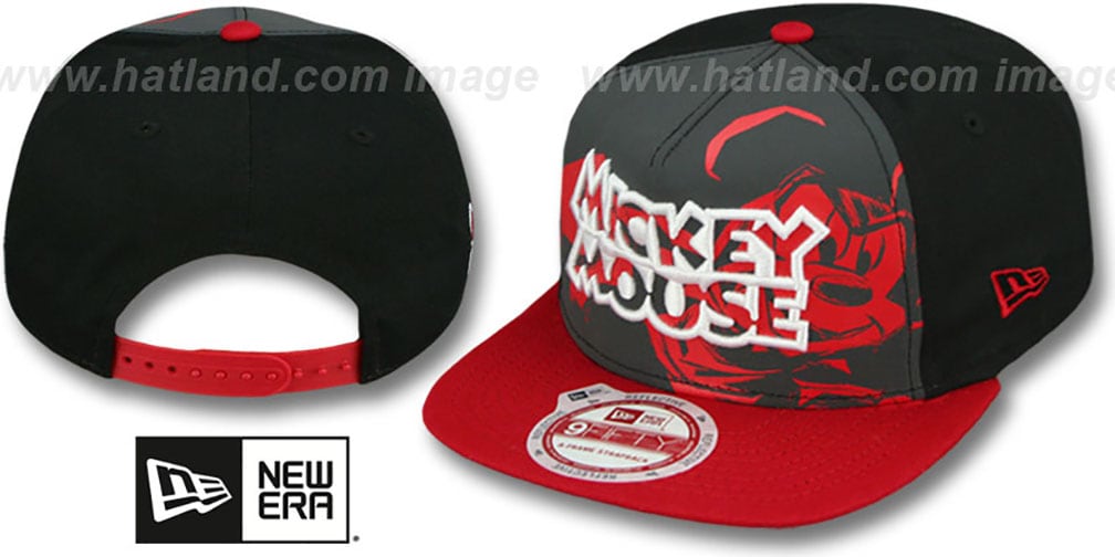 Authentic adjustable hat by New Era with 9FIFTY A-Frame original cut and flat brim, black cotton twill crown with REFLECTIVE dark grey front panels, raised embroidered Mickey Mouse on front in white with red Mickey Mouse print, red visor and light grey undervisor, New Era flag on side, embroidered MICKEY MOUSE on opposite side, adjustable plastic snapback strap. This Disney hat is made by New Era.