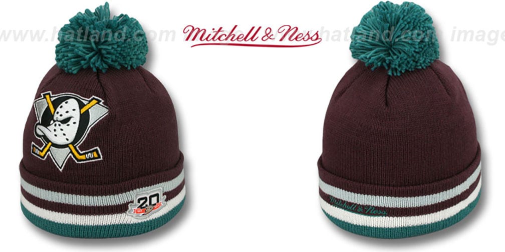 Acrylic knit Beanie by Mitchell & Ness, Extra-Large embroidered Mighty Ducks team logo on front, team color plum purple knit crown, team color striped cuff, embroidered 20th Anniversary patch on side, Mitchell & Ness embroidered on back, opposite team color pom-pom on top. This Anaheim Mighty Ducks merchandise is made by Mitchell & Ness and is licensed by the NHL - National Hockey League.