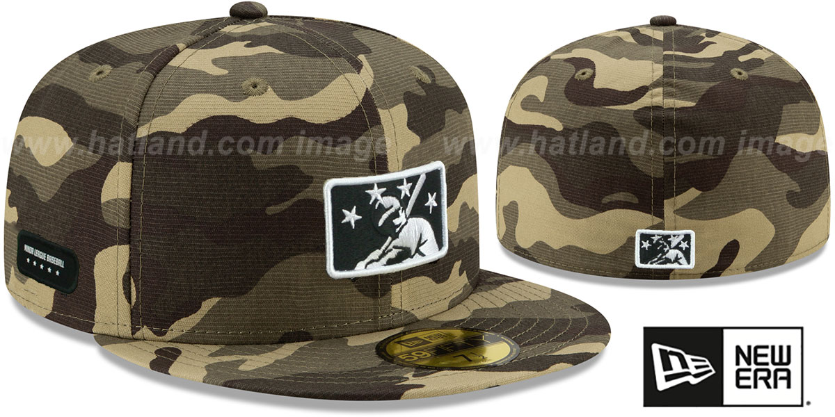 Authentic and ORIGINAL 59FIFTY fitted performance cotton rip-stop hat by New Era, Desert Storm camo crown and visor with black undervisor, raised embroidered 2021 Armed Forces Day MiLB logo on front in white and black, embroidered black patch on side with Minor league print in white, New Era logo on opposite side, matching MiLB logo on back, This is the Onfield hat worn by all MLB teams in games played during the 2021 Armed Forces weekend. These commemorative caps honor our Armed Forces through patriotic themes that remind us all of the dedication of our troops. A portion of proceeds from the sale of 'Stars & Stripes' caps support the Welcome Back Veterans Fund, an organization that provides support to veterans and their families when they come home from war. EACH CAMO HAT PATTERN WILL BE SLIGHTLY DIFFERENT SO NO TWO HATS WILL BE THE SAME. This MiLB Umpire baseball cap is made by New Era and is licensed by the MiLB - Minor League Baseball.