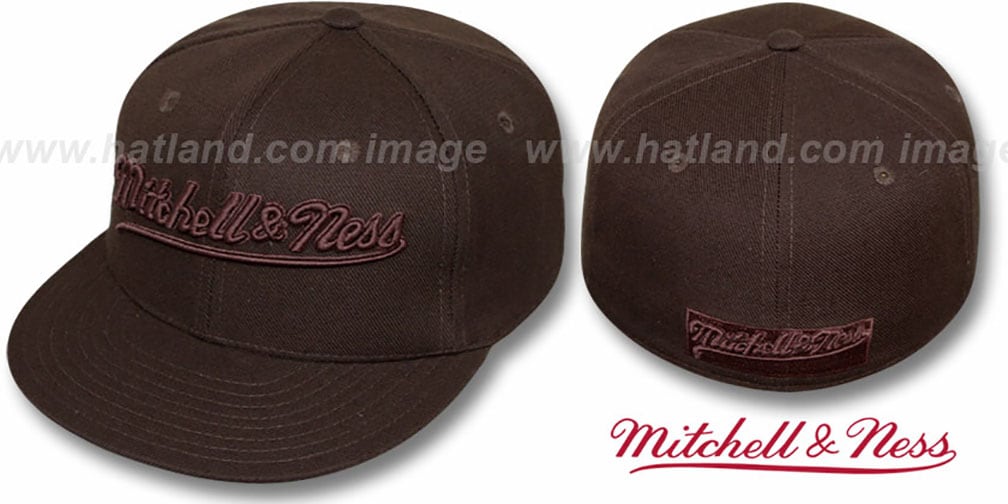 'Authentic' wool fitted hat by Mitchell & Ness with original cut and flat brim, brown crown and visor and undervisor, raised Mitchell & Ness script embroidery on font in brown with brown outline, matching embroidered Mitchell & Ness logo on back. This hat is made by Mitchell and Ness.